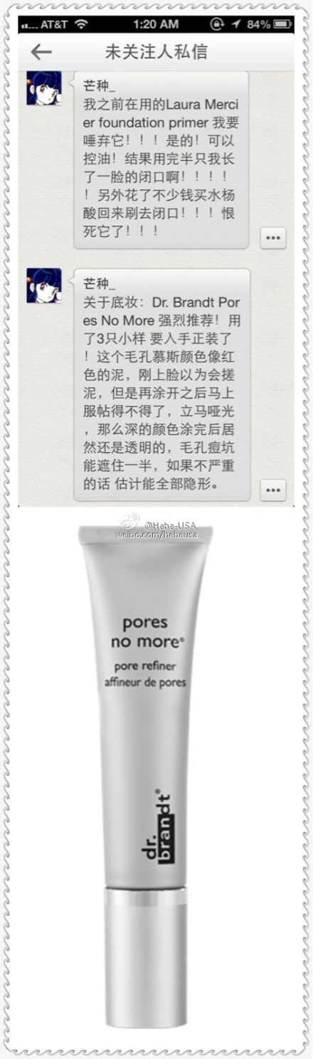 #闺密推荐# 底妆去毛孔神器:Dr. Brandt Pores No More 强烈推荐!用了3只小样 要入手正装了!这个毛孔慕斯颜色像红色的泥,刚上脸以为会搓泥,但是再涂开之后马上服帖得不得了,立马哑光,那么深的颜色涂完后居然还是透明的,毛孔痘坑能遮住一半,如果不严重的话 估计能全部隐形。http://t.cn/zRSn5DE