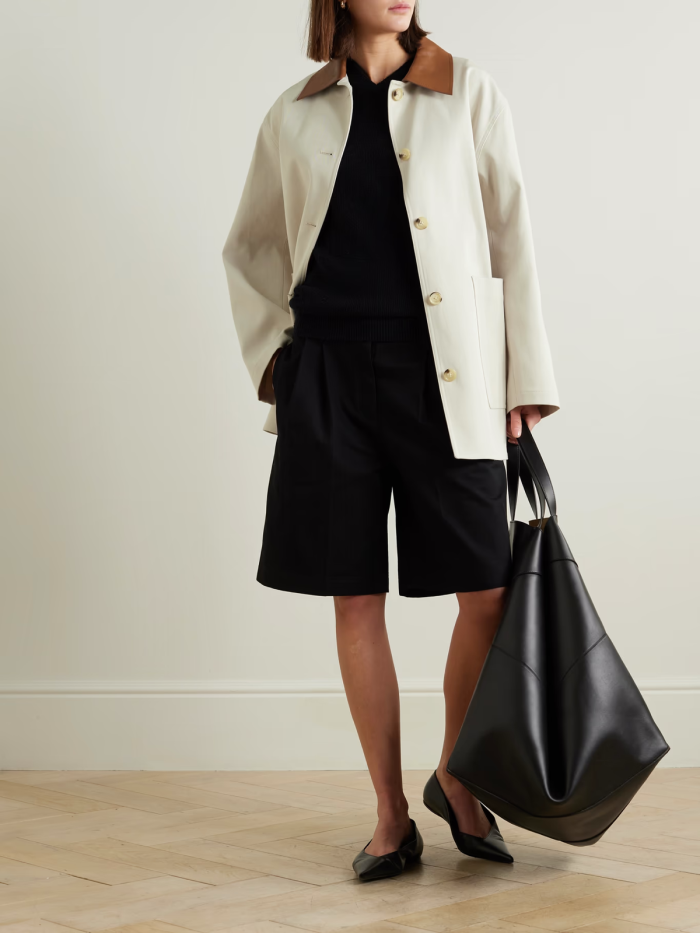 TOTEME 这款外套融入了诸多经典工装元素,风格简练、线条利落。它以厚实耐磨的纯棉斜纹布制成,设有实用风贴袋和异色皮革领,略带大廓形设计的衣身助你探索多样的搭配妙趣。