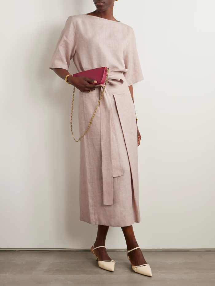 Loro Piana 这款半身裙低调而精致,可谓有着不过时的经典魅力。它采用亚麻、羊毛和真丝混纺面料制成,带有天然的纹理质感。褶裥与腰间系带穿着效果。