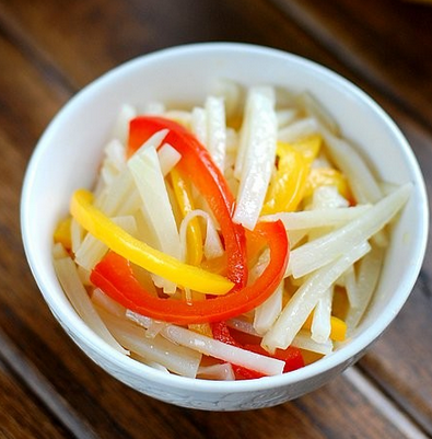 【彩椒拌脆藕】做法:1.藕去皮洗净,竖着切片,再切成丝。(竖着切的藕丝比较完整,不易断)2.切好的藕丝泡在水里;(泡去多余的淀粉,也防止氧化)3.彩椒切丝;4.锅内水烧开后关火;5.倒入藕丝和彩椒丝,迅速拌一下盛出;6.用凉水冲洗后,用冰的凉开水浸泡一下;7.加橄榄油,盐,糖拌匀即可!