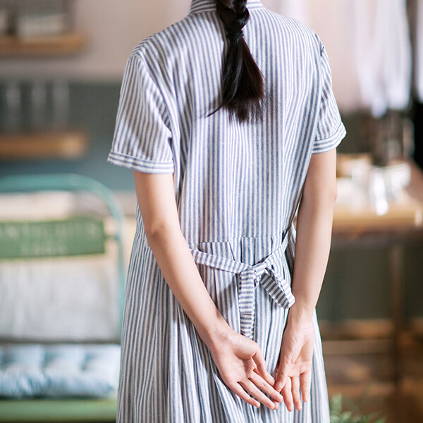 2014夏 沫里自制 日式MUJI风条纹亚麻 立领短袖宽松连衣裙 百褶裙