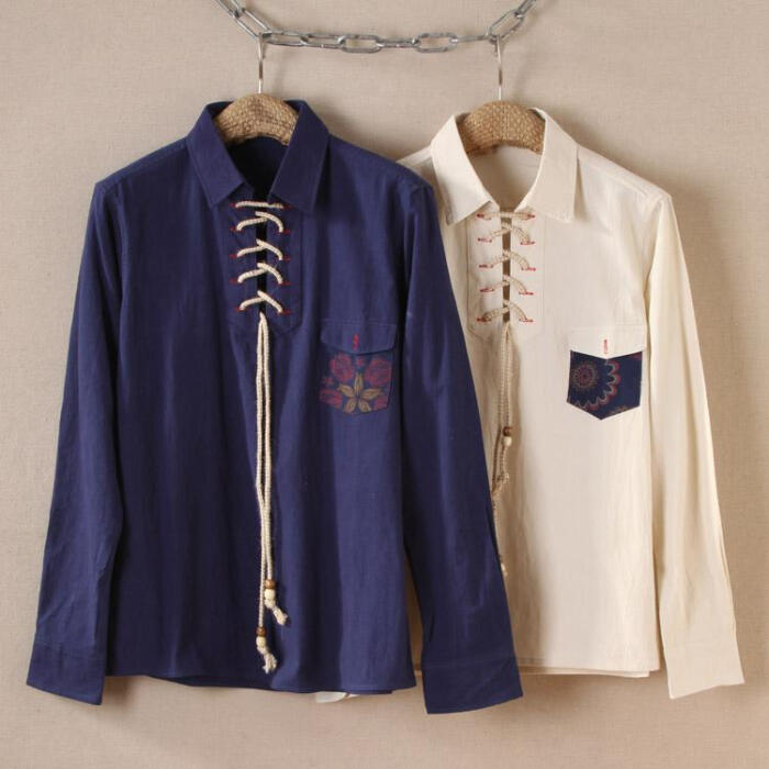 日系原创青年长袖衬衫原宿男装纯色亚麻衬衣复古衣服男士寸衫男潮