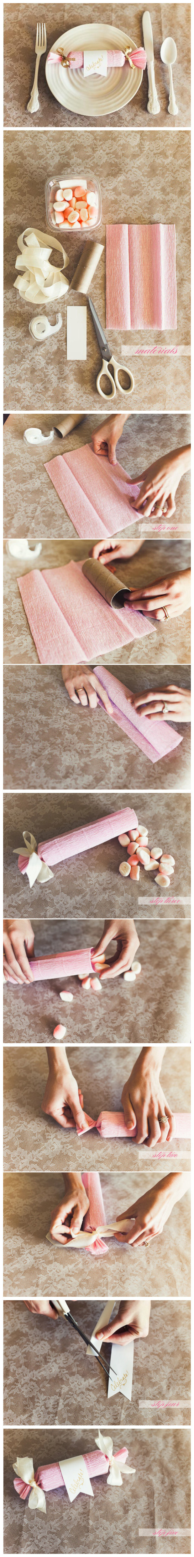 礼物包装方法之粉色糖果。材料:直筒/剪刀/胶/彩纸/丝带