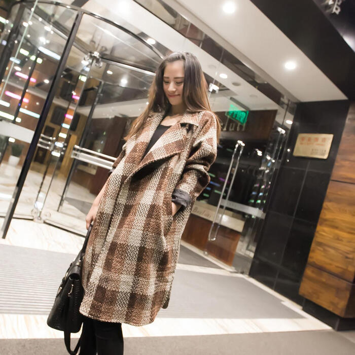 格子长款羊绒外套咖啡色 西草儿欧美潮宽松大大风衣披风长款风衣