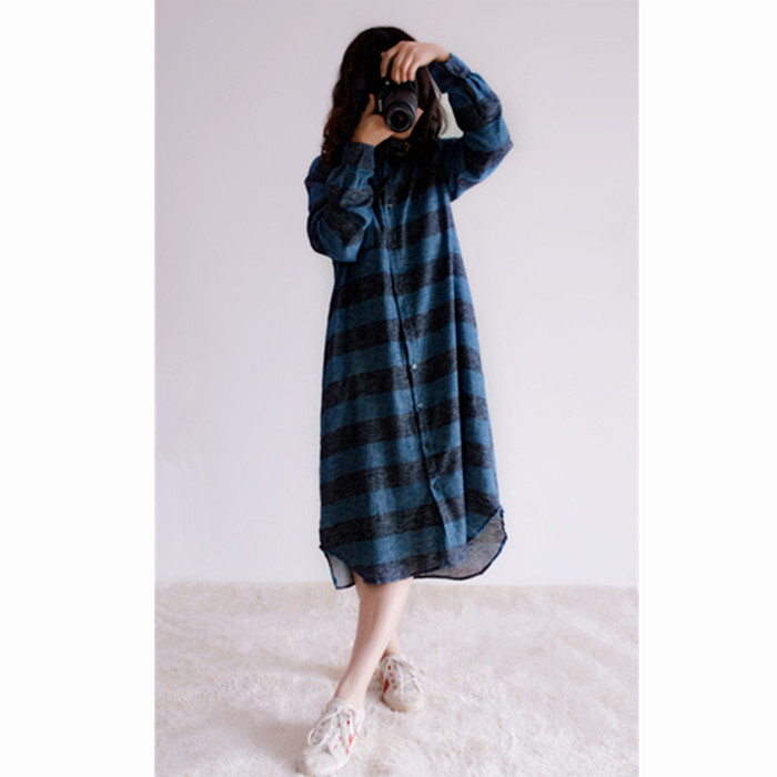 2015春款条纹衬衫裙长袖文艺青年宽松大码版型连衣裙复古全棉长裙