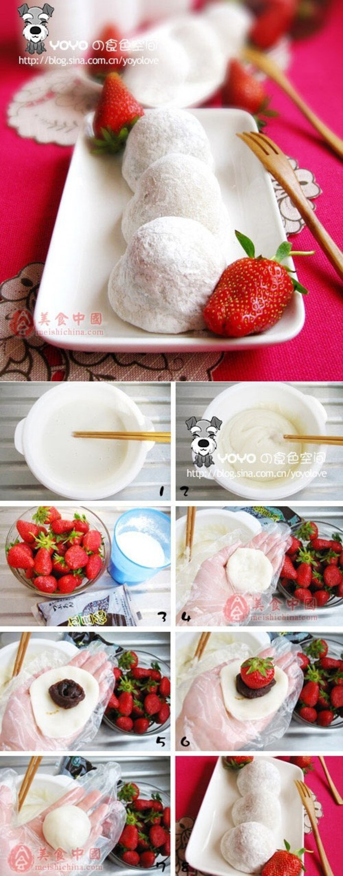 【草莓大福原料】糯米粉150g、生粉35g(玉米淀粉)、蜂蜜40g、色黄油20g、水250ml、红豆沙240g、大草莓8个、糖粉50g (禁二改,禁转发by:白白泰泰要幸福i)【做法】1 A 糯米团材料:糯米粉、生粉(玉米淀粉)、蜂蜜、色黄油、水(可做8个) B 红豆沙、大草莓、糖粉 2 把材料A调成酸奶一样的糊糊 3 装进微波炉用碗里,选择大火8分钟,每2分钟取出用筷子搅拌一次,面团越搅拌粘性越强 4 放到不烫手后,带上食品料理手套,取出60g左右的面团在手上压成圆饼 5 挤入30g红豆沙在糯米圆饼上 6 在豆沙中间放一颗草莓 7 把面皮聚拢收口,在手中滚成圆球形 8 最后在糖粉里打个滚即可