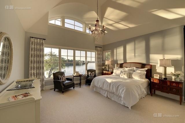 美式风格卧室,在细节上重点把握床头,窗户,阅读角等方面的设计,颜色搭配以灰色为主调,灰色墙面,搭配米色地面。