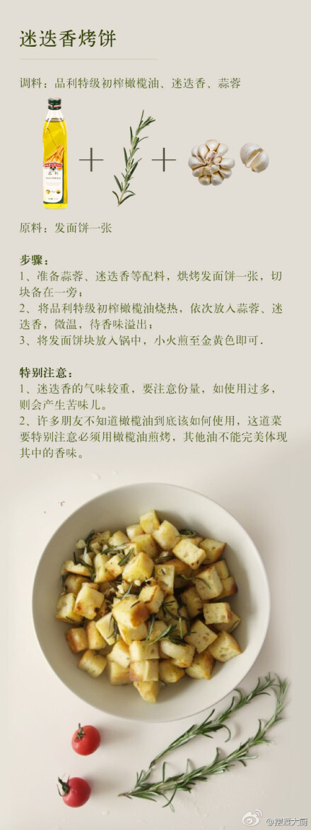 #厨匠工房#美食最本质的元素是自然,香草集结了自然的精华。就算是最简单的食物,配上美妙的香料也能让其美味芬芳四溢。7分钟偷闲,迷迭香烤饼。将迷迭香与清香的橄榄油混合在一起,褪去纯真,却别有番风味。