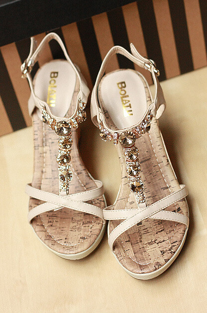 约会款水钻坡跟女鞋 美丽T型带设计显瘦水钻高跟鞋凉鞋 新款特价
