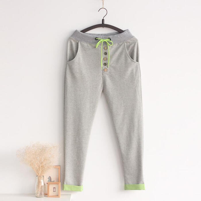 春装女清新拼色休闲松紧腰卫裤 抽绳翻边运动哈伦裤