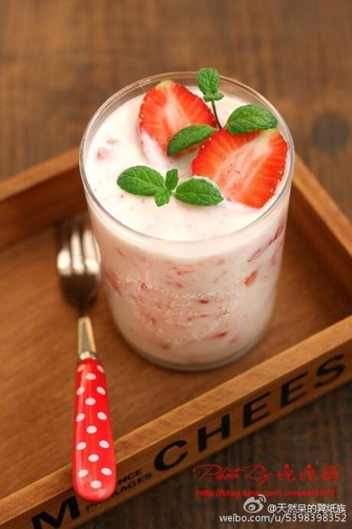【酸奶草莓奶昔】cr:(豆果)坨坨妈 主料:原味酸奶200克 ,草莓果酱1勺,新鲜草莓2颗。辅料:薄荷叶少许。做法 1. 一颗草莓切碎成小粒;2. 酸奶倒入玻璃杯中,然后加入草莓果粒,再加一小勺草莓果酱;3. 搅拌均匀;4. 将另一颗草莓对剖,放在表面,并放入几片薄荷叶做装饰即可。