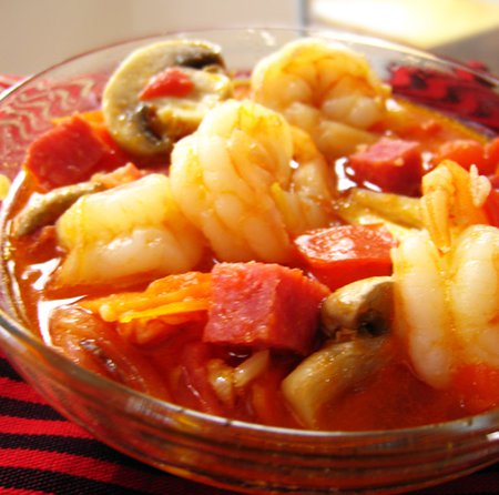 材料 虾 250g 西红柿 250g 口蘑 100g 洋葱 150g 盐 胡萝卜 200g 蒜 5瓣 芹菜 150g 熟火腿 200g 糖 <br />作法1.虾去皮和虾线,蒜切碎,西红柿和熟火腿切丁,芹菜,洋葱切丝,口蘑切片; <br />2.不沾锅烧热,锅中倒入特级初榨橄榄油,油温5成,放入蒜米炒香;3.随后放入虾,炒到基本变色,锅离火,放到一边备用;4.另起锅,倒入特级初榨橄榄油,油温5成放入火腿丁翻炒,而后放入西红柿,炒出汁水,再放入洋葱和芹菜,炒出水成汤汁,放入盐和糖调味;5.把口蘑和炒好虾连同蒜米一同倒入汤汁中,煮开即可。