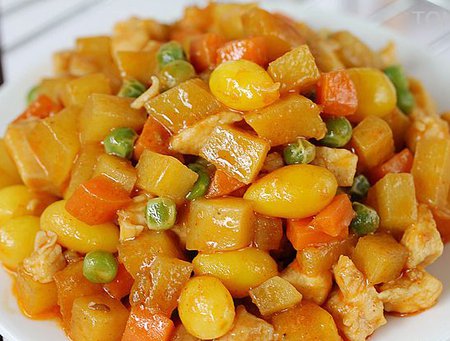 材料 鸡胸肉 土豆 青豆 生粉 料酒 香油 胡萝卜 银杏 黄豆酱 食用油 <br />韩式辣椒酱 <br />作法 <br />1.所有食材清洗干净,土豆去皮切丁后用水冲一下; <br />2.鸡胸肉和胡萝卜也切丁; <br />3.在鸡丁里放入一勺生粉,一勺料酒,搅拌均匀放置15分钟; <br />4.热锅冷油,加入胡萝卜丁和土豆丁翻炒2分钟左右; <br />5.加入一勺黄豆酱,加入一勺韩式辣椒酱,翻炒几下,加入半碗水,煮开; <br />6.加入鸡丁,调味,收汁,淋上香油即可出锅。
