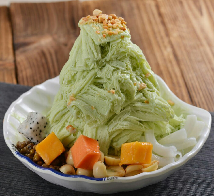 『抹茶绵绵冰』 绵绵冰粉,水,糖和抹茶粉混合,搅拌至溶解;分次加入搅拌机进行搅拌,先搅拌3分钟,静置5分钟,再搅拌10分钟,如果加淡奶油可在此前加入,并手动搅拌均匀;分次倒入模具进行冷冻8-10个小时;把模具倒置,在背后冲冷水,同时拇指按压模具,即可脱出冰块;冰块放回冰柜翻冻1-2小时。