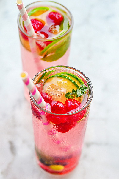 【覆盆子莫吉托】⑴原料:覆盆子12粒,苏打水500ml,青柠檬1个,朗姆酒30ml,薄荷叶10片,蜂蜜20g,冰块适量。⑵做法:1、备好食材。2、青柠檬一半切片,一半备用。3、在准备好的苏打水里加入一半的覆盆子。 4、半个青柠檬挤出汁。5、加入薄荷,冰块。6、加入朗姆酒。7、加入蜂蜜。8、另一半的覆盆子榨成汁加入里面。