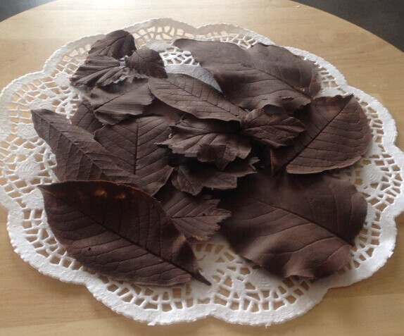 【巧克力树叶】材料:新鲜叶子、巧克力 做法:1.收集新鲜的叶子用清水洗净,用厨房用纸吸去表面的水分。2.巧克力装入裱画袋隔水融化后挤在叶子的正面。3.然后用勺子背面将巧克力抹匀。4.抹好的叶片放在冰箱中冷藏10分钟以上,完全凝固后轻轻揭掉叶子即可。