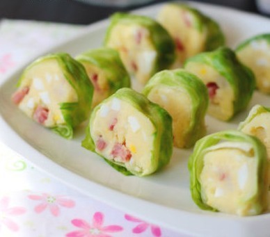 「土豆寿司泥」材料:土豆,奶油,鸡蛋,腊肠,生菜,盐。 步骤:1.土豆削皮切块,加奶油,微波炉高火转8分钟。 2.锅里加没过鸡蛋的水,水开后8分钟取出放凉。 3.用勺子将土豆碾成泥,加入蛋黄碾,搅匀。 4.加切好丁的蛋白和腊肠搅匀,中间加盐调味。 5.将土豆泥捏成粗条,用生菜叶包好,在蒸锅中蒸30秒,取出切块即可。