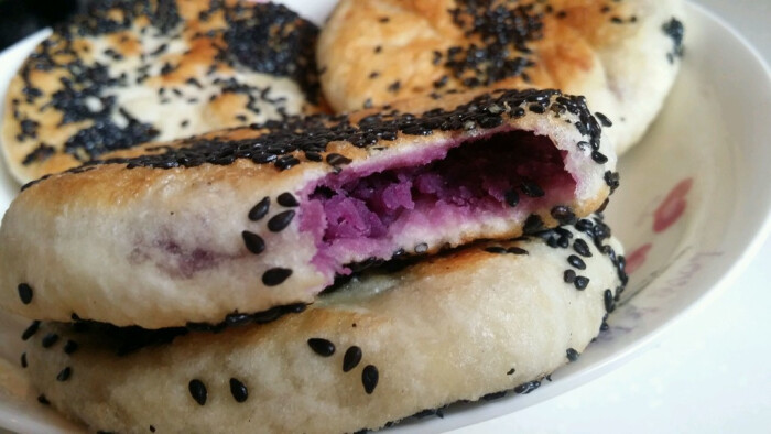❁『紫薯饼』❁用料:面粉200克 紫薯(泥)100克 酵母2克白糖适量 芝麻适量 做法:1.酵母溶于少量温水倒入面粉中,加入适量的温水揉成光滑的面团,盖上保鲜膜放置一个小时发酵。紫薯泥加白糖拌匀 ;2.面团发酵至两倍大时取出,揉成长条,分成小剂子擀成皮;3煮好的紫薯泥放入按扁的面皮中,慢慢地将其合拢后封口,撒上芝麻,轻轻按扁,再醒十分钟;4.放入煎锅,烙至两面金黄即可