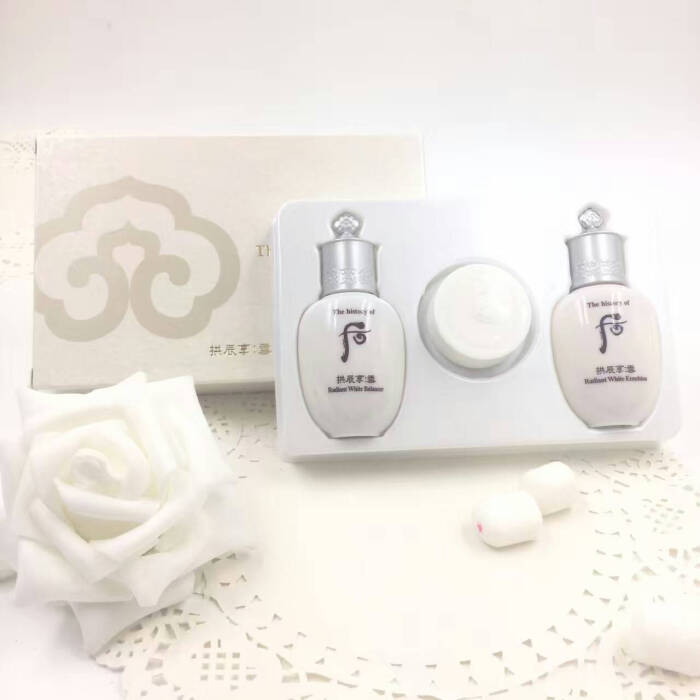 whoo后拱辰享雪美白水乳六月套盒美白水:150ml美白乳液:110ml美白安瓶:5ml*3美白津膏:4ml(灰盖)美白水分膏:4ml(白盖)眼部精华5ml