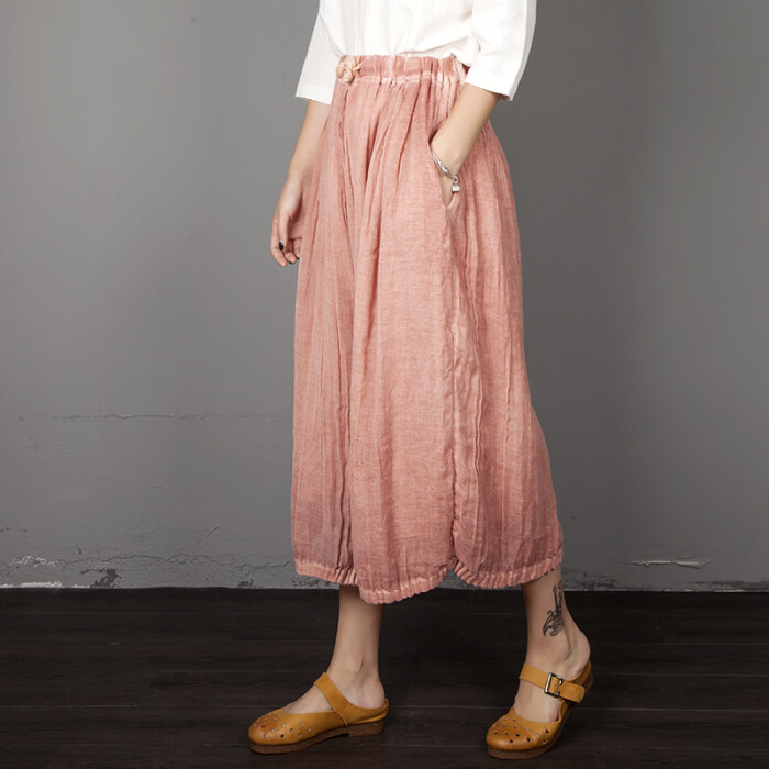馨桔文艺棉麻松紧腰 宽松休闲多口袋不规则九分裤阔腿裤裙裤纯色