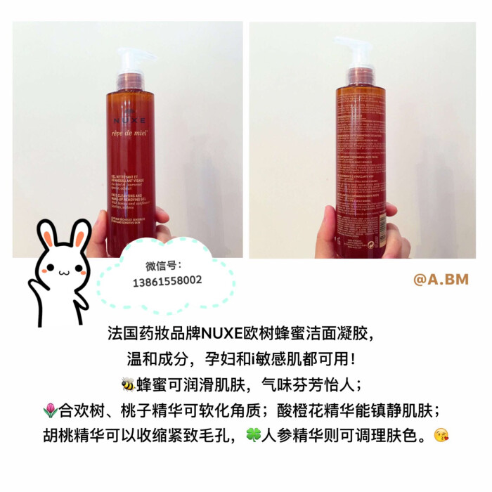 法国药妝品牌NUXE欧树蜂蜜卸妆洁面凝胶200ml,温和成分,孕妇和i敏感肌都可用!蜂蜜可润滑肌肤,气味芬芳怡人;合欢树、桃子精华可软化角质;酸橙花精华能镇静肌肤;胡桃精华可以收缩紧致毛孔,人参精华则可调理肤色。