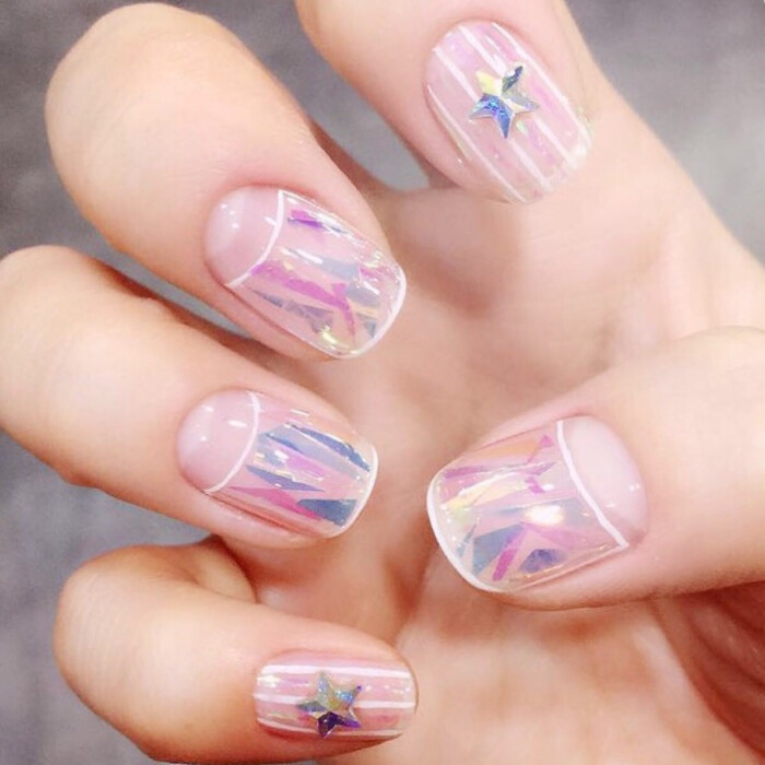 美甲 法式 碎玻璃 白色 镂空