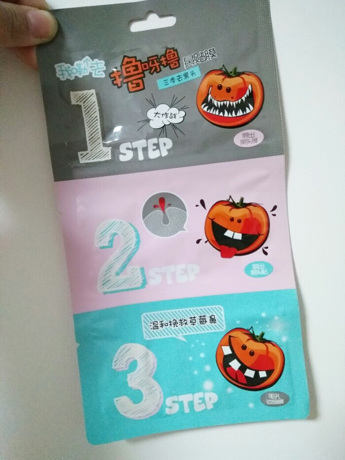 番茄派鼻贴膜,有三张,导出,吸出,收缩。我黑头不是很多,但是好奇,所以买了用用看,第一贴贴完后,真的有白头冒出来,第二贴撕的效果不是很理想,第三贴是那种透明的像果冻的材质,感觉还是有一些效果的*^o^*