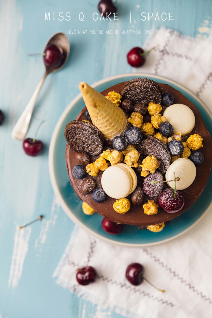 巧克力蛋糕,马卡龙,水果,淋面,冰淇淋