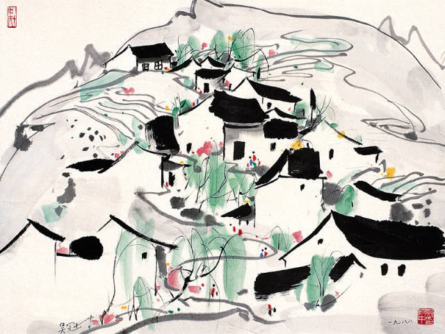 【 吴冠中 《张家界马鬃岭》】纸本设色,104×202cm,1979年作。 1979年11月,画家听信朋友介绍,在农民的带领下,到尚沒有名气的张家界写生。当到达安排休息的林场场部时,吴冠中被眼前秀美的景色惊呆了,如拣到了一颗明珠那样的兴奋,飞快的画出了此幅作品。马鬃岭,一个奇异幽深的世界。