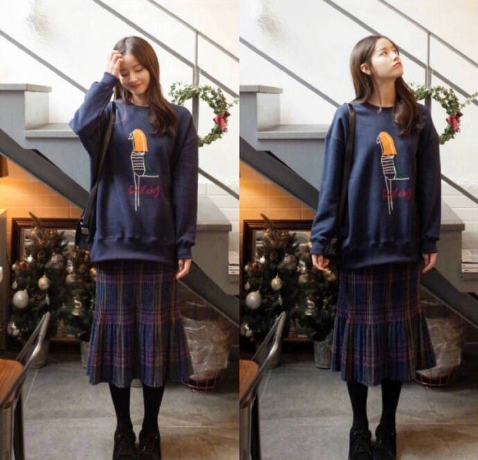 秋冬穿搭,宽松加长上衣+裙子配打底裤,冬天也可以穿裙子