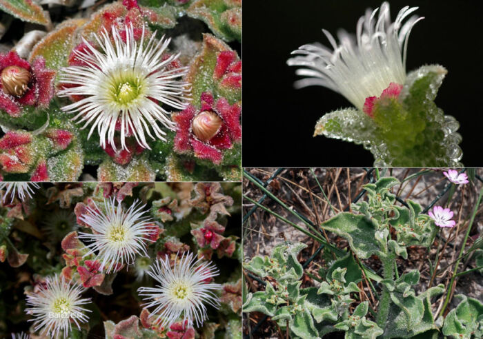 冰叶日中花Mesembryanthemum crystallinum Linn.番杏科日中花属一年生矮生草本植物.该属75钟,多数为原产于旧大陆的荒漠草本植物,具肉质叶.冰叶日中花栽培最普遍,叶上有透明、反光的隆起,故名。盆栽或栽于花园,叶可食。在加利福尼亚已归化,用以覆盖路堤,可防水土流失。一年生或二年生草本。茎匍匐,长30-60厘米。叶互生,叶片扁平,带肉质,卵形或长匙形,长15厘米,宽7.5厘米,基部几心形,紧抱茎,边缘波状,有发亮颗粒,下部叶有柄。花单个腋生,直径约2.5厘米,几无梗;花瓣多数,线形,比萼片长,带白色或浅玫瑰红色;花柱5,丝状,柱头5。蒴果5室,裂瓣脊有翅。冰叶日中花在