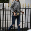 驼色翻领大衣,内搭红格子衬衫,搭配棕色的休闲包包和平底鞋。Lily Collins