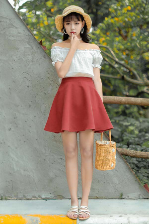 红色上衣,带有原宿风设计的袖子,宽松版型超好穿的,搭配下身裙满满的学院风。