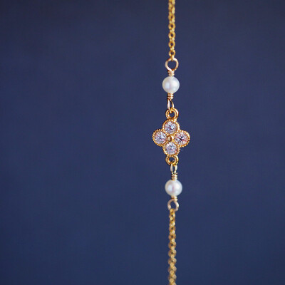 定制 Cloudcity 银镀金锆石四叶草淡水圆珍珍珠14k包金手工手链细链女